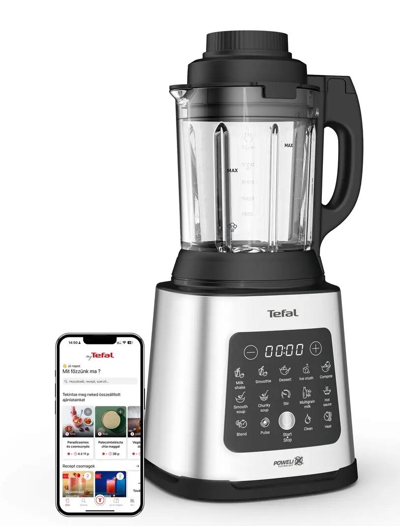 A Perfectmix Cook turmixgéppel számtalan ételt készíthet, a jeges üdítőktől és gyümölcsturmixoktól kezdve a meleg, sűrű levesekig és pörköltekig. Ez a sokoldalú, melegítő funkcióval felszerelt Tefal turmixgép nagy sebességű, erőteljes turmixolást és még sok más funkciót kínál, így néhány kattintással készíthet meleg, hideg, turmixolt és turmixolás nélküli ételeket. Fedezze fel a 10 automatikus programot hideg és meleg ételek készítéséhez, valamint a gőzölési funkciót egy speciális kosárral, amely a turmixgépet egészséges gőzölőedénnyé alakítja – ideális turmixgép a tápanyagokban gazdag hal-, zöldség- és a tenger gyümölcseiből készült ételek elkészítéséhez. A főzés utáni takarítás nem is lehetne egyszerűbb – a kivehető pengékkel és a baktériumok 99,99%-át elpusztító, egyedülálló mélytisztító funkcióval az eszköz tökéletesen higénikus, az Ön egészsége érdekében. A nagyteljesítményű Powelix késes technológia hihetetlen teljesítményt nyújt, amely akár 30%-kal gyorsabb, és az intuitív érintőképernyővel együtt korlátlan lehetőségeket biztosít a főzéshez. 10 automatikus program A 4 hideg (turmix, koktél, desszert, fagylalt) és 6 meleg (kompót, krémleves, sűrű leves, többmagvas tej, csípős szósz) programnak köszönhetően hideg és meleg ételek széles választékát készítheti el két kattintással. Nagy teljesítmény Fedezze fel a nagysebességű turmixolást 1400 W-os motorral és csúcsminőségű Powelix késekkel a hihetetlen teljesítményért, amely akár 30%-kal gyorsabb. A Tefal LM2B/BL2C-es turmixgéphez képest. Egyszerű tisztítás Kivehető pengék és mélytisztító funkció, amely a tökéletes tisztaság és higiénia érdekében eltávolítja a baktériumok 99,99%-át, mosogatószer használata nélkül. A vizsgálatokat független laboratórium végezte. Egészséges párolás A termék részét képezi a gőzölt ételek készítésére szolgáló kosár, amely a turmixgép edényét nagyméretű gőzölőedénnyé (+/- 500 g) változtatja, amely ideális halból, zöldségből, friss tenger gyümölcseiből készült ételek vagy akár tojás gőzön történő elkészítéséhez. Csúcsminőségű dizájn A termék prémium minőségű anyagokból készült, beleértve a kiváló minőségű üvegedényt, amelyet fémelemek és az intuitív kezelést biztosító elegáns érintőpanel kísérnek. Léghűtéses rendszer A beépített léghűtéses rendszer optimális motor élettartamot biztosít. Egészséges főzés A készlet tartalmaz egy gőzölőkosarat a még egészségesebb főzés érdekében. Segítségével ízletes halat, zöldséget, tenger gyümölcseit vagy akár tojást is fogyaszthat! Ezenkívül a 4 manuális programnak köszönhetően teljes mértékben kézben tarthatja a teljes főzési folyamatot. Jellemzők: – Teljesítmény: 1400W – 10 automatikus program – Pengetechnológia: Powelix Pengék = 30%-al gyorsabb – Eltávolítható pengék – Programok: 10 – Jégaprító funkció – Sebességfokozatok: 6 sebesség + pulzáló funkció – Kancsó teljes űrtartalma: 2 L – Kancsó anyaga: Üveg – Elektromos feszültség: 220–240 V – Frekvencia: 50–60 Hz